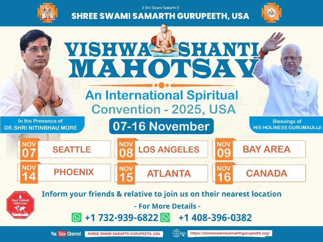 16 Nov VSM2025 Vishwashanti Mahotsav 2025 : Toronto, Canada October 22, 2025 By Jadhav Jadhav With the divine blessings of Shree Swami Samarth Maharaj and His Holiness Gurumauli and in the presence of Hon. Dr. Nitin Bhau More, we... Continue reading