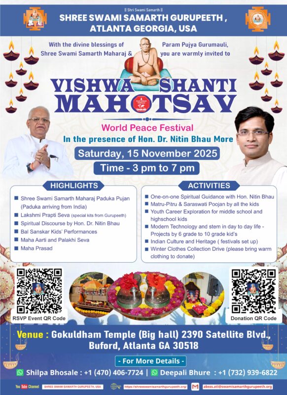 With the divine blessings of Shree Swami Samarth Maharaj and His Holiness Gurumauli and in the presence of Hon. Dr. Nitin Bhau More, we will be conducting Vishwa Shanti Mahotsav 2025, on Saturday, 15 Nov 2025.